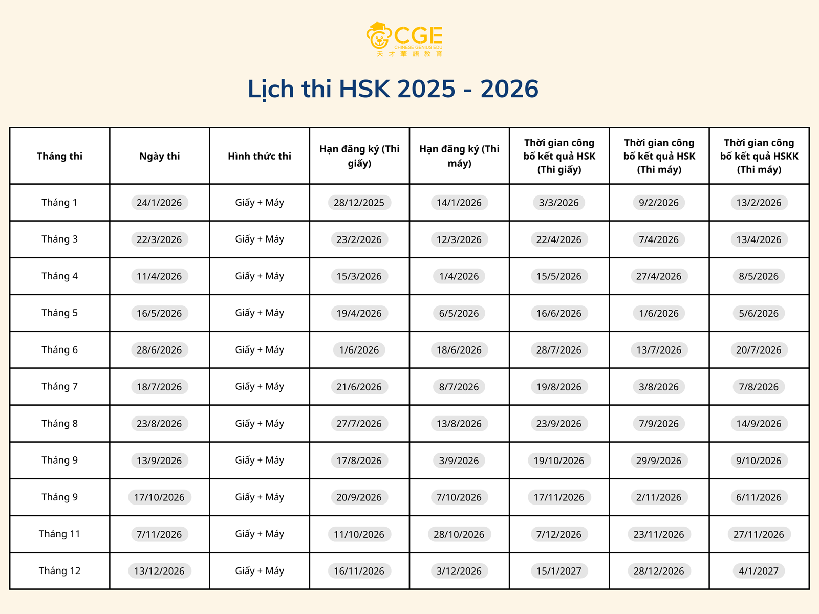 Từ năm 2025, lịch thi vẫn được tổ chức cố định hàng tháng theo kế hoạch của Hanban/Chinese Test Center. Để giúp bạn dễ dàng theo dõi, dưới đây là bảng tổng hợp lịch thi HSK - HSKK năm 2025-2026: