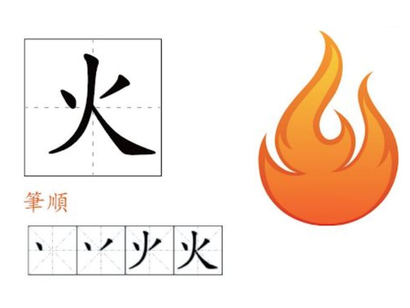 Chữ 火 trông giống như một ngọn lửa đang bùng cháy, với hai nét xiên dưới đại diện cho tia lửa bay ra.
