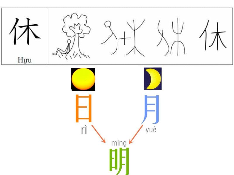 明 /míng/ Sáng: 日 /rì/ Mặt trời + 月 /yuè/ Mặt trăng -> biểu thị ánh sáng rực rỡ.