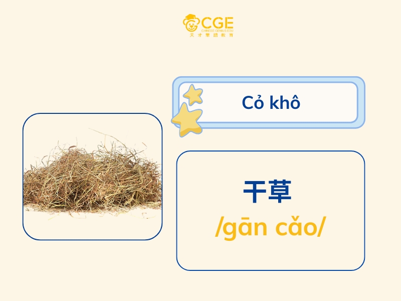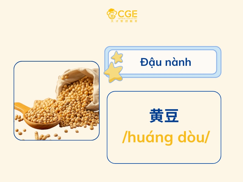 黄豆 /huáng dòu/、干草 /gān cǎo/: Đậu nành, Cỏ khô