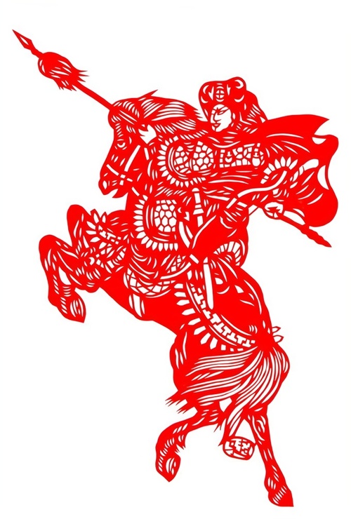 Các nghệ nhân cắt giấy thường tái hiện các câu chuyện lịch sử một cách sinh động thông qua việc cắt những hình tượng nhân vật lịch sử. Các hình mẫu được cắt thường là những vị tướng nổi tiếng như Quan Công, Trương Phi hay các vị anh hùng trong Thủy Hử,… Hầu như khi cắt về các nhân vật trong lịch sử, những người nghệ nhân sẽ cố gắng khắc họa đúng nhất về chân dung cũng như đức tính của các vị tướng.